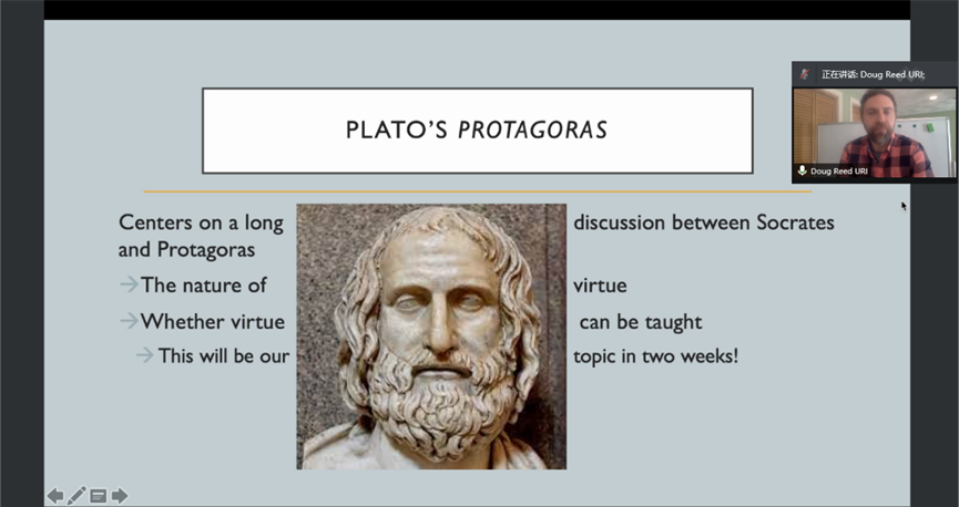 From April 9 to May 7, 2021, Doug reed, assistant professor of the Philosophy Department of the University of Rhode Island, the United States, was invited to open an international demonstration base for teachers and students of the College of Philosophy and Sociology and overseas high-quality courses "Socratic Philosophy in Plato’s Early Dialogues" through Tencent conference platform.