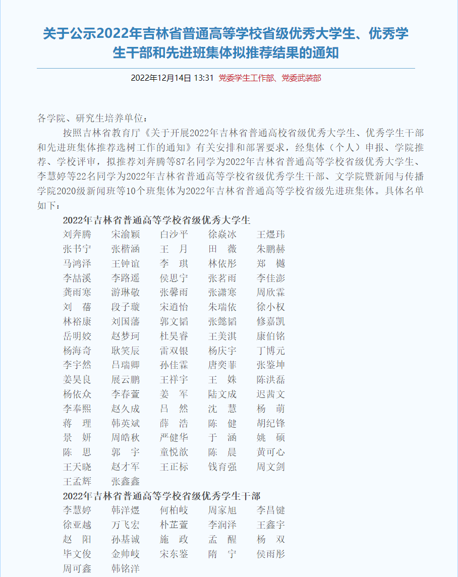 近日,根据吉林省教育厅《关于开展2022年吉林省普通高校省级优秀大学生、优秀学生干部和先进班集体推荐选树工作的通知》有关安排和部署要求,经集体(个人)申报、学院推荐、学校评审,我院2019级社会学专业本科生刘奔腾同学、2020级马克思主义哲学专业博士生姜昊良同学荣获2022年吉林省普通高等学校省级优秀大学生荣誉称号;2020级劳动与社会保障专业本科生李慧婷同学荣获2022年吉林省普通高等学校省级优秀学生干部荣誉称号。