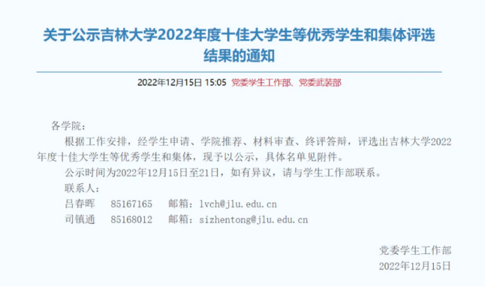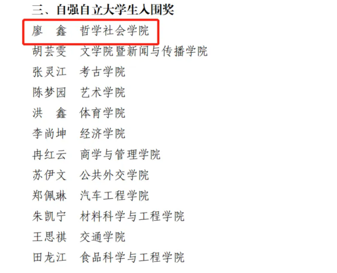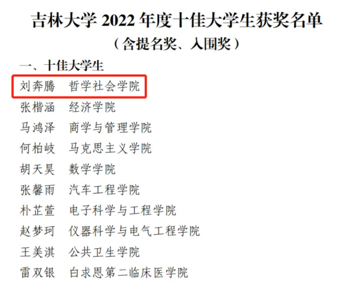 近日,根据吉林大学《关于开展2022年度“吉林大学十佳大学生”“吉林大学十佳班级““吉林大学自强自立大学生”评选工作的通知》有关安排和部署要求,经集体(个人)申报、学院推荐、学校评审,我院2019级社会学专业本科生刘奔腾同学荣获吉林大学2022年度“十佳大学生”荣誉称号;2019级哲学1班荣获吉林大学2022年度“十佳班级”提名奖;2019级社会学专业本科生廖鑫同学荣获吉林大学2022年自强自立大学生入围奖。