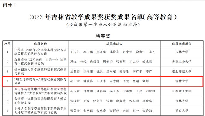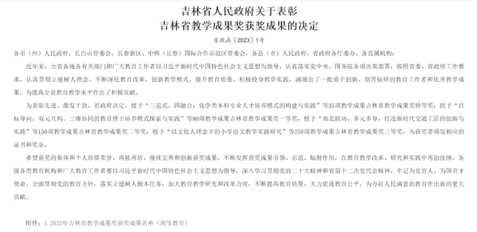近日,吉林省人民政府颁布了《关于表彰吉林省教学成果奖获奖成果的决定》,我院多位教师榜上有名,累计斩获特等奖一项,三等奖三项。