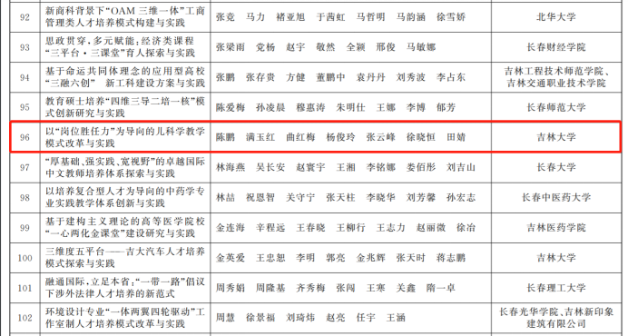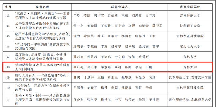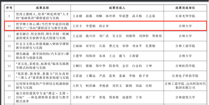 其中,我院孙正聿等教师主持的《“用理论铸魂育人”的思政教育实践与创新》课题荣获特等奖;王庆丰等教师主持的《哲学博士核心课<当代哲学前沿问题研究>“三导向”课程设计与教学实践》,曲红梅等教师主持的《哲学课程综合改革与实践的“学科育人”机制研究》课题,曲红梅与吉大二院的陈鹏等教师主持的《以“岗位胜任力”为导向的儿科学教学模式改革与实践》课题均荣获三等奖。