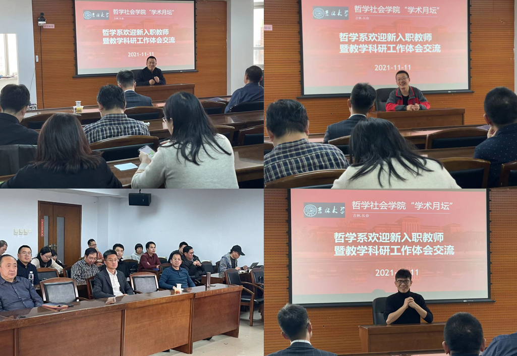 三位新近入职教师,分别介绍了自己的求学和工作经历,讲述了自己学术研究体会。袁立国老师讲述了自己从求学到成为吉大哲学系教师的心路历。在分享研究经验时,袁立国老师表示,确定研究目标需要一段时间的反复琢磨,也建议后来者做学问时不要急于定下目标,哲学需要“找到感觉”。云龙老师高度赞扬吉大哲学研究的水平,吉大哲学系是“真正有哲学的地方”,这是他自己兜兜转转之后回到吉大哲学系的最主要原因。云龙老师结合自己博士后期间的研究,总结说:“无论研究什么方向都一定要不断雕琢自己的学术成果,直至形成体系,这才是做哲学应该有的态度。”郝志昌老师讲述了自己多年以来跨学科求学的经历,讲述了自己从事生命政治研究的体会以及与在座老师从师生关系转为同事关系的奇妙经历。