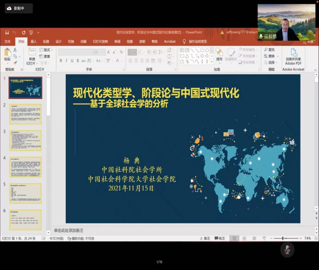 名家系列”讲座第149场——《现代化类型学、阶段论与中国式现代化:基于全球社会学的分析》,以线上会议的方式成功举行。主讲人为杨典研究员,哈佛大学社会学博士、中国社会科学院社会学所副所长、中国社会科学院大学社会学院副院长。本次讲座由田毅鹏院长主持,我院100余名同学线上参加了此次会议。