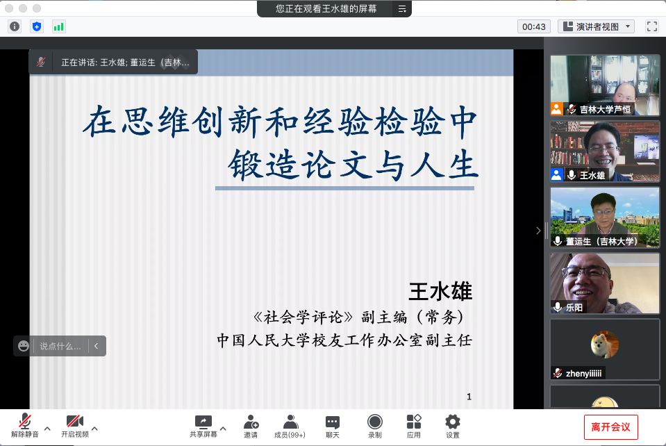 第148场名家讲座通过腾讯会议的形式在线上举办。中国人民大学社会学理论与方法研究中心、社会与人口学院教授、博士生导师王水雄教授,为线上百余名师生带来题为《在思维创新和经验检验中锻造论文与人生》的学术讲座。社会学系主任董运生教授主持本场讲座。