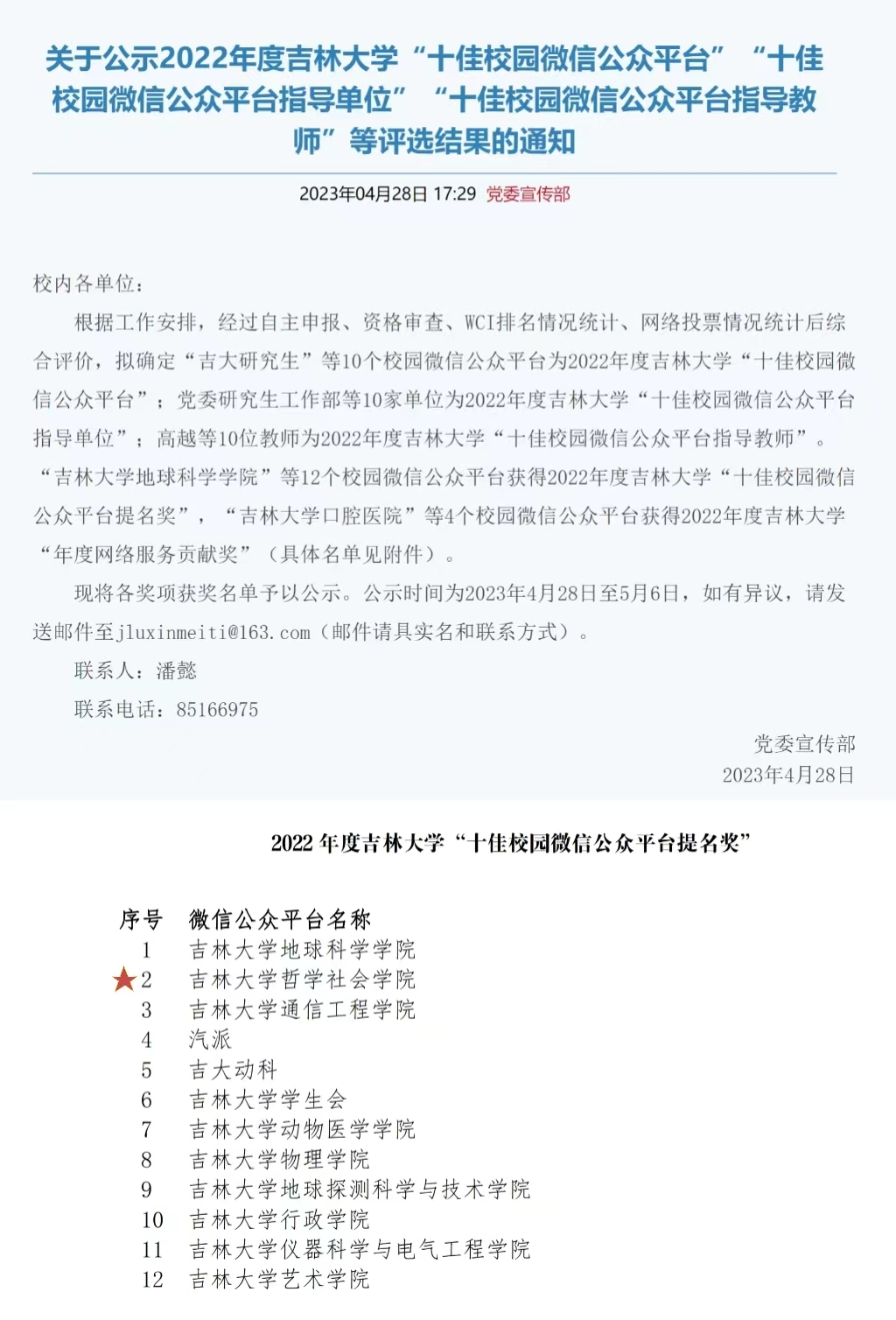 ”荣获2022年度吉林大学“十佳校园微信公众平台提名奖”,这也是我院微信公众号首次入围吉林大学“十佳校园微信公众平台”评选活动。