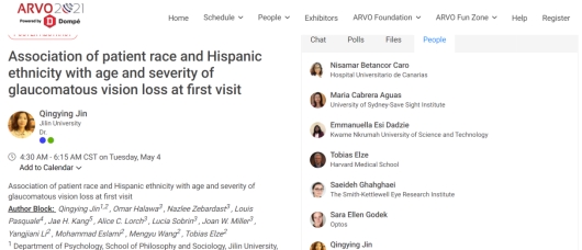 本届年会的主题是:变革性的眼与视觉研究。在过去的十年里,创新和先进的技术促进了眼睛和视觉研究领域的重大发现,与其他任何学科的发现不相上下,2021年大会的主题是关注人类视觉的下一场革命。我院金庆英副教授受邀参加了本次大会,并做了题为《Association of patient race and Hispanic ethnicity with age and severity of glaucomatous vision loss at first visit》的报告。研究有助于发现病理视觉在不同人群中的特征差异,进而为正常视觉的解剖生理机制研究指引方向,同时也为临床干预提供依据。该报告引发了与会者的热烈探讨,这些宝贵的建议和交流对视觉的相关研究具有重要的启发意义。