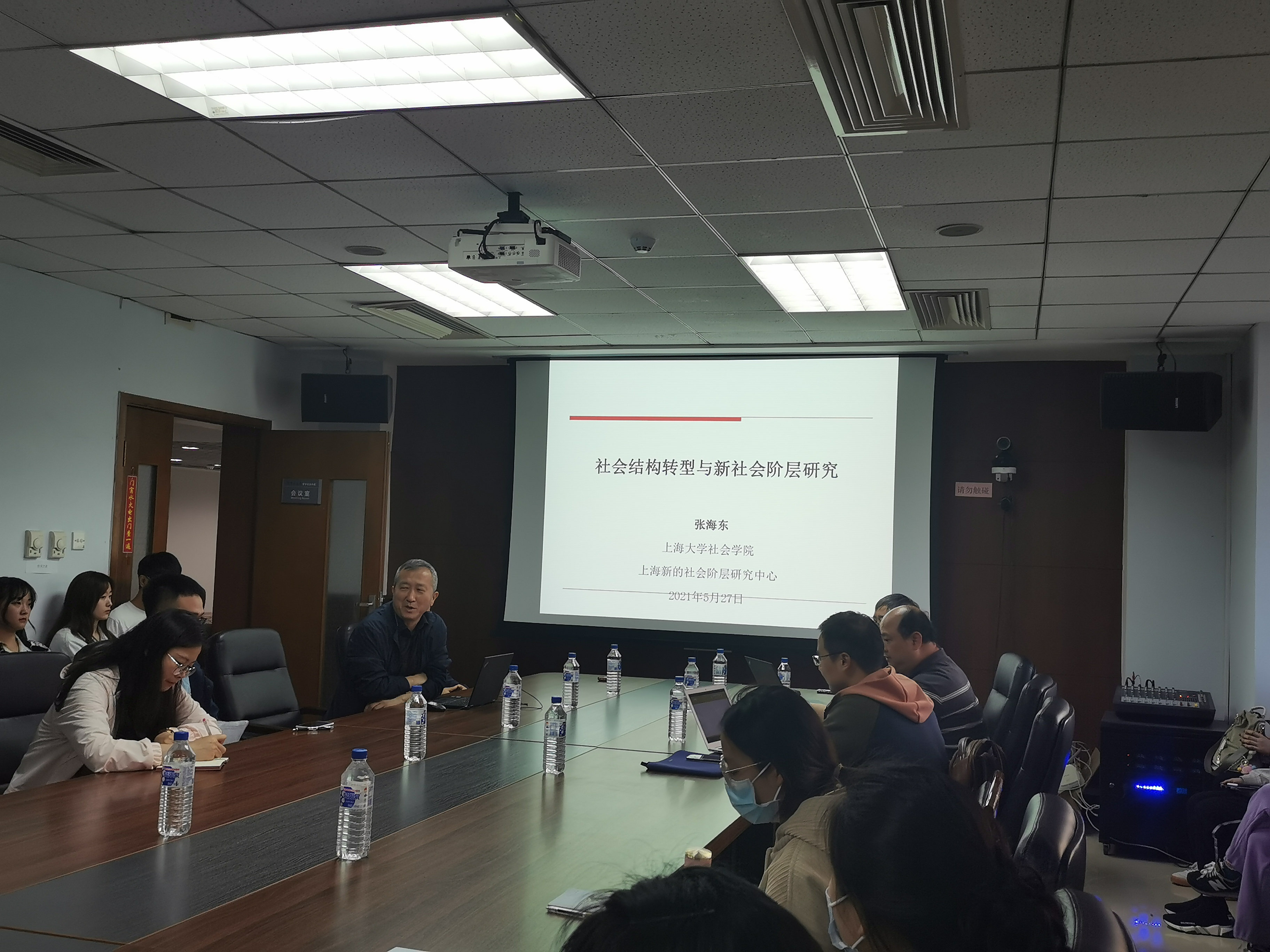 张教授首先指出,本次讲座的题目包含两层意涵。一是新社会阶层研究本身也是社会结构研究的一部分。二是新社会阶层研究对处于转型过程中的中国社会而言具有重大意义。结合多年研究思考和研究成果,张海东教授围绕着社会结构转型及其基本判断、新社会阶层及其群体特征和新社会阶层研究中的重要问题这三个方面进行详细阐述。他强调社会结构优化是保持社会稳定的重要原因之一,而社会结构研究是社会学研究的核心领域。对研究者而言,“如何观察社会结构的变化?”是开展研究之初首要回答的问题。张教授认为,在我国急剧社会变迁过程中,职业系统已经发生,并且还在持续发生着深刻的变化,当今社会职业种类纷繁复杂,人们不再拘泥于单位制和少数几种职业的限制,职业选择和职业流动更加多元、更为频繁,意味着考察职业结构和职业流动特征是分析中国社会结构的一个重要切入点。基于数据分析,张海东教授肯定了当下中国社会结构特征正朝向橄榄型社会迈进的趋势,认为在特大城市中橄榄型社会发展已然初具雏形,而导致这一社会结构形态产生的重要原因则在于新社会阶层的崛起和壮大。
