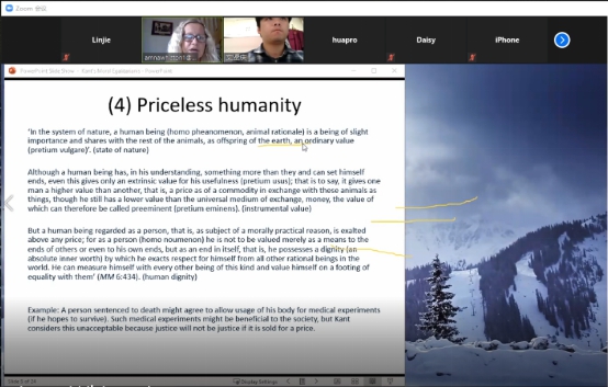 在此次讲座教学过程中,课堂气氛活跃,师生积极参与讨论。提问环节我院教师与同学踊跃提问,Amna Whiston博士耐心解答。本次讲座为“康德的道德平等主义”给出了一个很好的解释,为我院师生理解康德道德哲学体系中人类尊严理念的位置提供了坚实的文本分析视角。