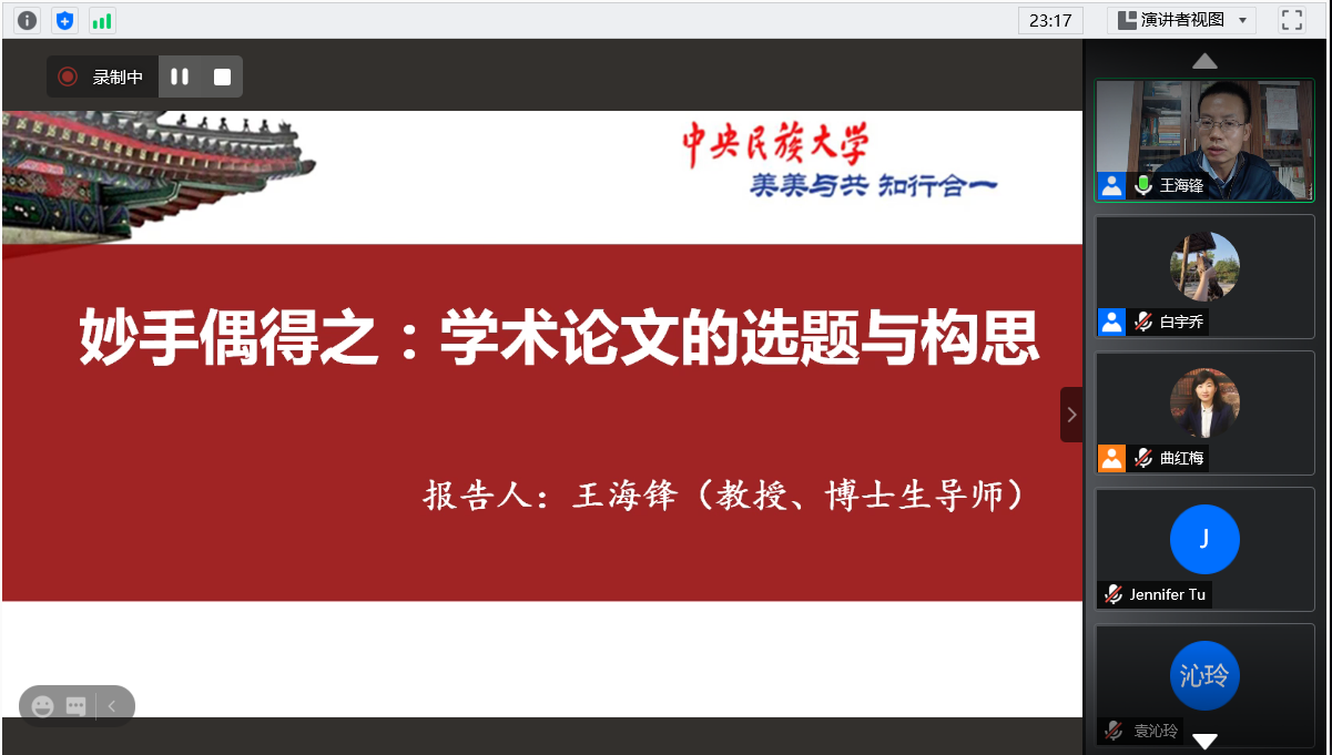 学术教育提升工程”第八讲以腾讯会议的形式进行。此次讲座由吉林大学曲红梅教授主持,中央民族大学王海锋教授主讲。讲座的题目为《妙手偶得之:学术论文的选题与构思》。