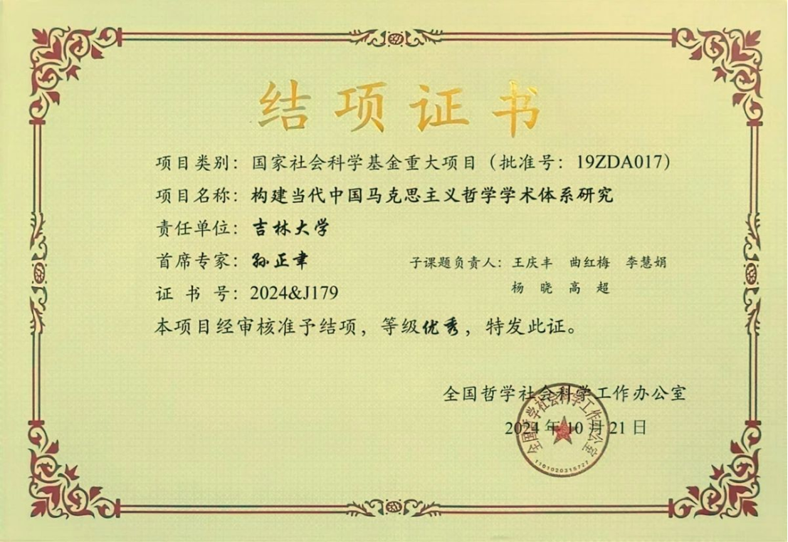 近日,由吉林大学哲学社会科学资深教授孙正聿任首席专家的国家社会科学基金重大项目“构建当代中国马克思主义哲学学术体系研究”(2019ZDA017)通过专家评审,顺利结项并获评优秀。这是孙正聿教授担任首席专家主持完成的第三项国家社会科学基金重大项目。