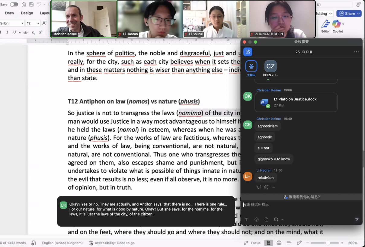 本次项目依托在线平台ZOOM开展,由剑桥大学资深教学团队担纲授课,课程内容聚焦科学哲学、心灵哲学、希腊哲学三大学术方向,精准对接学科发展趋势与学生研究需求。经学生自主报名、学院严格遴选及项目方面试考核等多轮筛选,我院共9名学生参加了此项目。