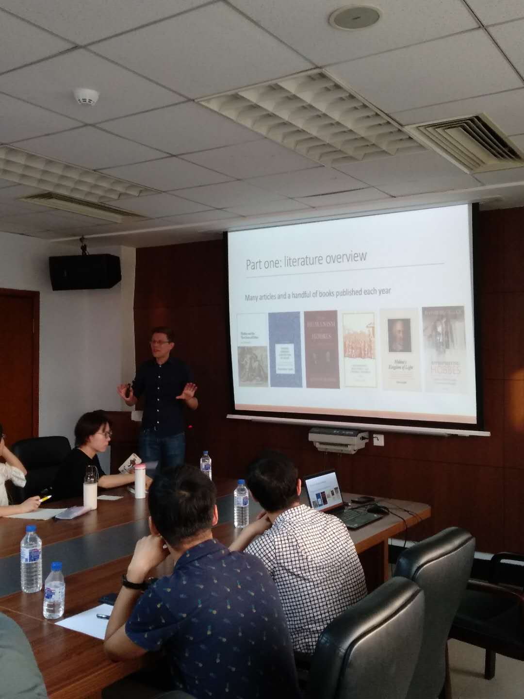 在讲座的第一部分,Johan围绕着当代的霍布斯研究文献进行综述。首先,当代的霍布斯研究呈现出方法论的多元主义特征。这主要是因为不同领域的学者从各自领域带来了不同的方法论。Johan认为,我们至少可以辨认出三组最重要的方法论上的对立。第一组是研究视野不同导致的文本式进路和语境式进路的对立,第二组对立是研究目标的不同导致的阐释进路与评价/重构进路的对立,第三组对立是研究方法的不同导致的分析进路和非分析进路的对立。其次,当代霍布斯研究重点也有所转变。例如越来越多的研究看重作为整体的霍布斯著述,又如对霍布斯的宗教哲学的兴趣日盛。当然,还有一些仍在进行中的争论:霍布斯在何种程度上是一个自由主义思想家?霍布斯思想中的“代表”、“自由”、“国际法”、“国际关系”、“宽容”等话题也依然引人深思。最后,Johan提醒我们,霍布斯研究中也有一些方面没有得到足够的重视:优秀的比较研究仍然缺乏,霍布斯的形而上学、逻辑学、自然哲学也没有得到充分的讨论。虽然霍布斯在经典的政治问题上(代表、主权、国际关系、和平)是公认的重量级思想家,霍布斯的思想对许多当代政治问题也意义非凡,例如全球正义、宗教政治和生命政治等问题。但30年前主要由博弈论进路所激发的霍布斯式的政治哲学却逐渐衰落,不再流行。