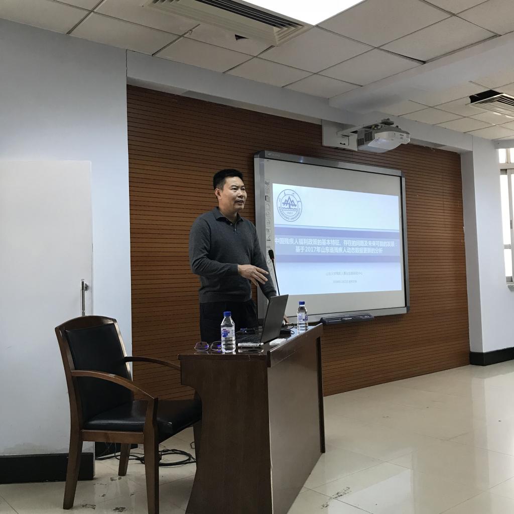 学术名家讲座第28场在东荣大厦9楼会议室举行。中国残疾人事业发展研究会副秘书长、中国残疾人事业发展研究会社会工作专业委员会副主任委员、济南市残疾人福利基金会理事长、山东大学残疾人事业发展研究中心主任、山东大学哲学与社会发展学院博士生导师葛忠明教授,作了题为“中国残疾人福利政策的基本特征及未来可能的发展方向:基于山东省2017年动态更新数据的分析”的学术讲座。劳动与社会保障系系主任董才生教授主持了本场讲座。