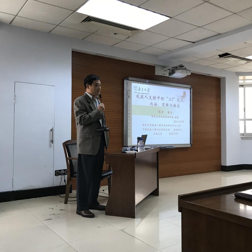 2018年9月29日上午9:00,中国残疾人事业发展研究会副秘书长、中国残疾人事业发展研究会残疾人社会工作委员会主任委员、南京大学残疾人事业发展研究中心主任、南京大学政府管理学院博士生导师周沛教授,在吉林大学东荣大厦九楼会议室作了题为“残疾人支持中的‘三I’范式——内涵、逻辑与推进”的学术讲座。本次讲座由重庆时时彩