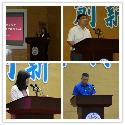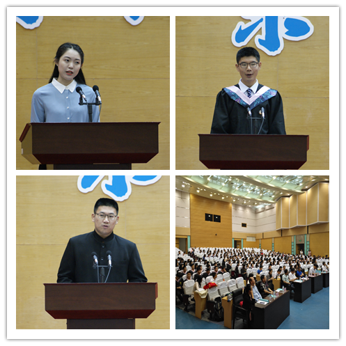 完成了拨穗仪式和毕业证书的颁发之后,学生代表们依次上台发言。第一位上台的是毕业研究生代表,来自2015级马克思主义哲学专业的硕士研究生那玉同学。那玉同学回忆了在吉林大学七年学习的点点滴滴,引发了在场同学们的共鸣。之后,毕业本科生代表,来自2014级社会学专业的本科生、吉林大学2017年十佳大学生陆兵哲同学在发言中回忆了在校专业学习中的收获,感恩了母校和学院在专业领域中的“启蒙教育”与培养。最后,在校生代表,2015级哲学专业本科生、校学生会主席、院团委副书记张翊轩同学进行了发言。张翊轩同学从自己出入大学的场景开始回忆,对毕业生表达了感恩,并最后呼吁同学们“常回家看看”,将离愁别绪推向了一次高潮。
