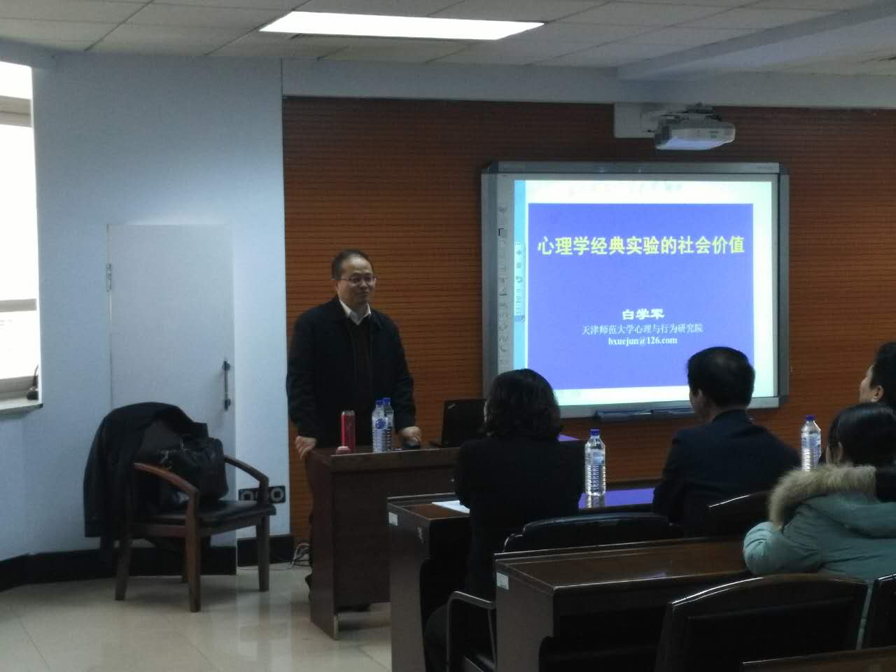11月14日下午,中国心理学会现任理事长、天津师范大学心理与行为研究院院长白学军教授,在我校东荣大厦九楼会议室为广大师生作了一场题为“心理学经典实验的社会价值”的精彩学术报告。