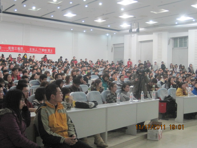 讲座当天下着雨,可是,讲座现场依然十分火爆,座无虚席,热情的学生从临近的课室搬来凳子坐在过道,甚至好多同学不得不站着听老师的讲座。老师从心理学角度专业而独到的分析,配合其精彩而风趣的讲解,更加使得爱情这个永恒的话题丰盈和深刻,同学们听得聚精会神,此起彼伏的掌声中不断有本在自习的同学加入听讲。不管是单身还是身旁已经有人的同学,这次讲座无疑让他们受益良多——爱情需要付出,也同样需要智慧。愉快的时间似乎总是过的飞快,眨眼间就过去了两个多小时。讲座结束后,同学们仍意犹未尽,很多同学留下来和老师进行了热烈的讨论,直至很晚才散去。