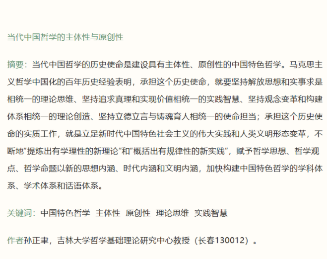 文章还认为,构建具有主体性、原创性的中国特色哲学,要求我们以“不忘本来、吸收外来、面向未来”的胸怀、视野和担当,“坚持古为今用、洋为中用,融通各种资源,不断推进知识创新、理论创新、方法创新”,自觉地承担起“立时代之潮头、通古今之变化、发思想之先声”的使命担当,自觉地“做真善美的追求者和传播者”,自觉地“为祖国、为人民立德立言”,为实现中华民族的伟大复兴和推进人类文明形态变革作出我们的贡献。