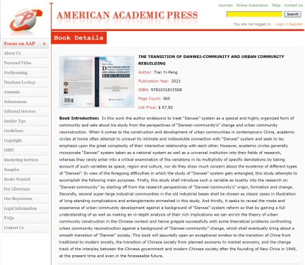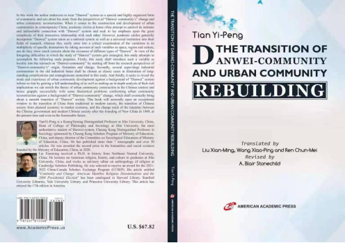 院长田毅鹏教授的专著《“单位共同体”的变迁与工业社区重建》入选2013年《国家哲学社会科学成果文库》,于2014年4月由中央编译出版社出版。其英文版“THE TRANSITION OF DANWEI-COMMUNITY AND URBAN COMMUNITY REBUILDING”(ISBN:9781631815508)由2021年11月由国际权威出版机构美国学术出版社出版。译者为吉林大学公共外语学院刘贤明博士等。
