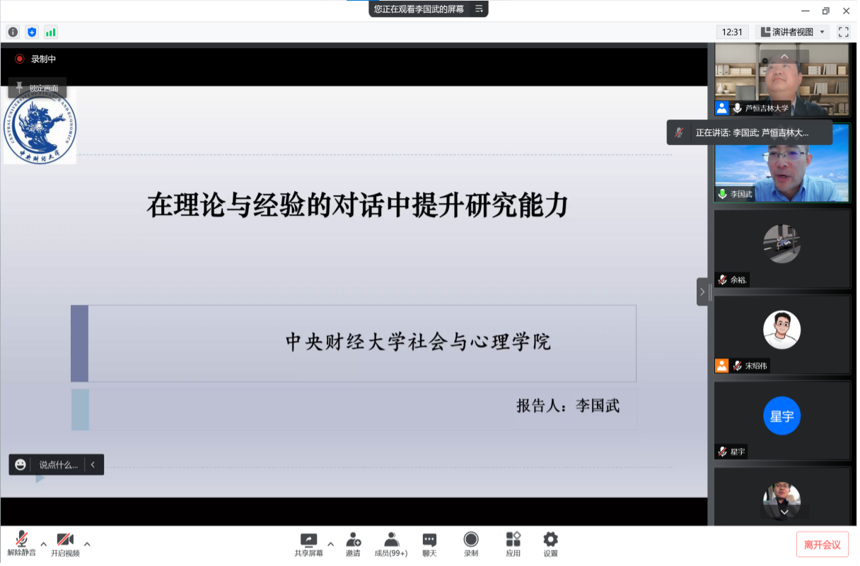 2022年4月18日19时,我院“学术教育提升工程”系列讲座2022年第三讲如期举行。本次讲座嘉宾是中央财经大学社会与心理学院院长、社会学系教授,我院社会学系1994级系友李国武教授。李教授以 “在理论与经验的对话中提升研究能力”为题与我院师生展开亲切交流。讲座由副院长芦恒教授主持,我院社会学系系主任董运生教授等多位教师参加了讲座。