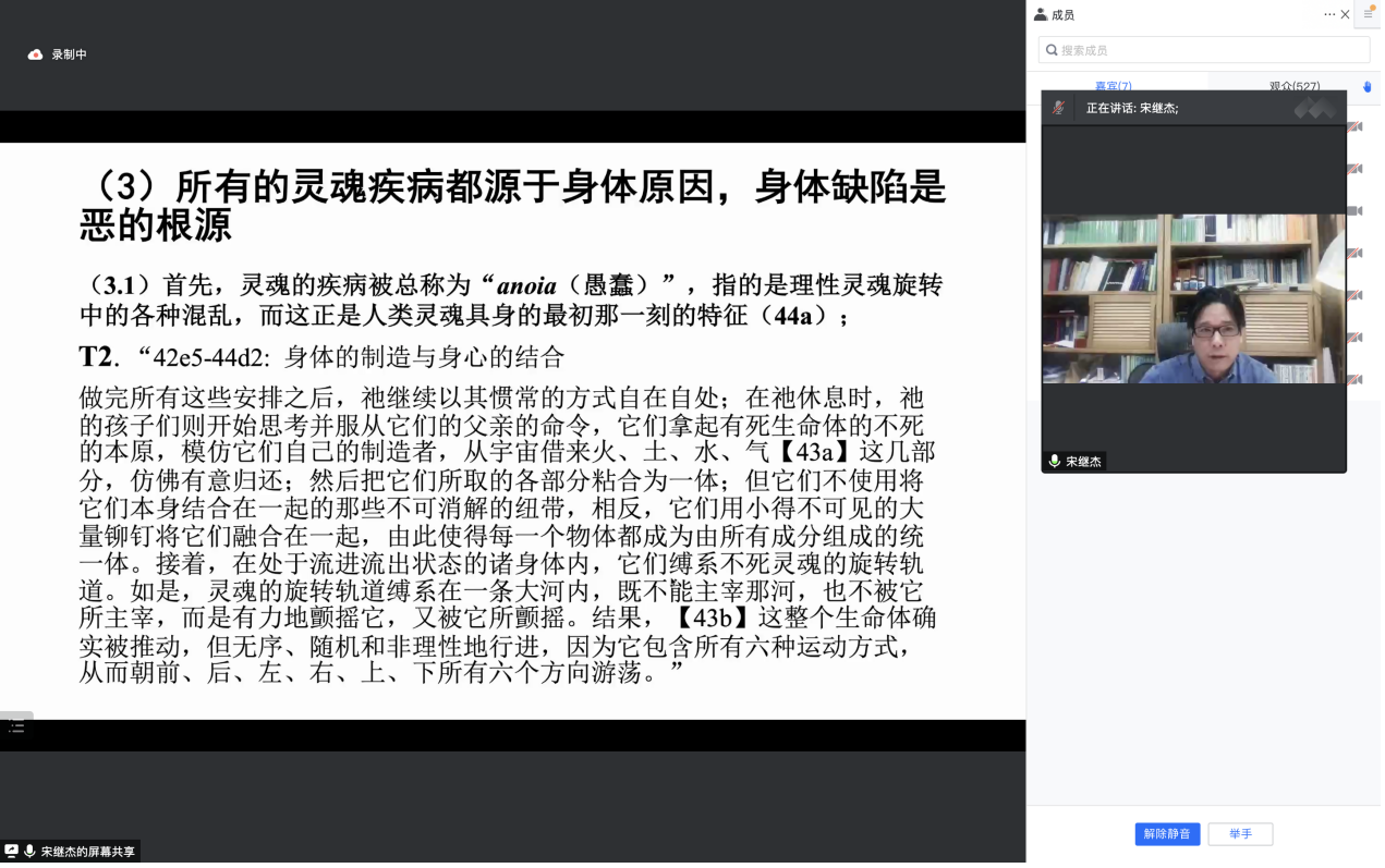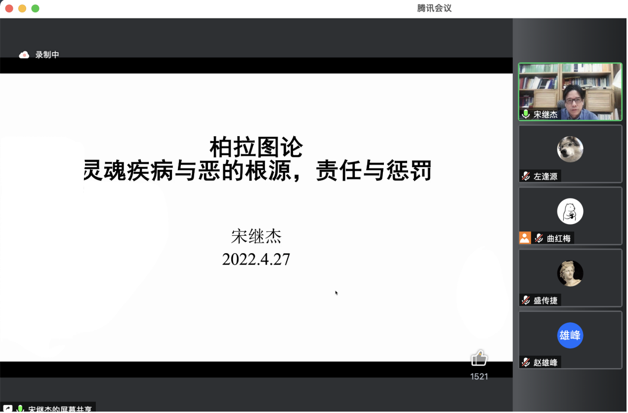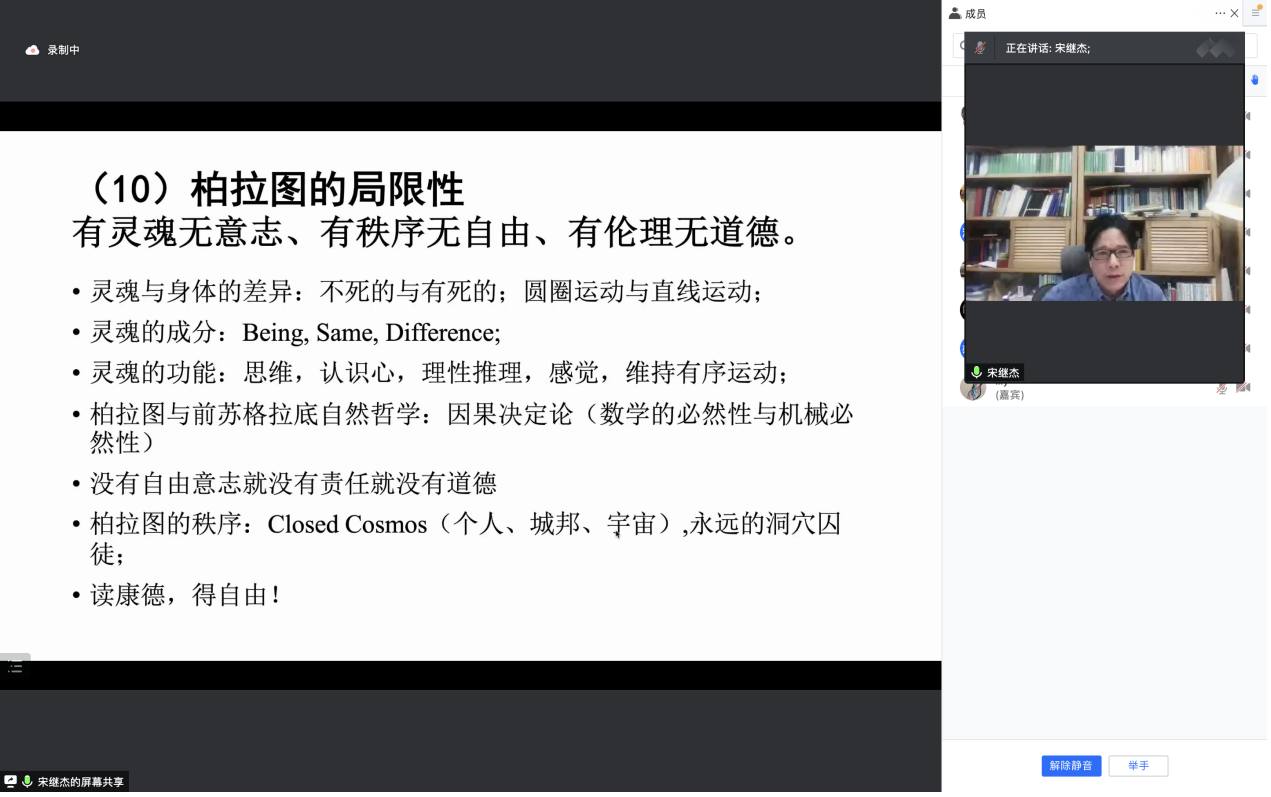 学术教育提升工程”系列讲座第五讲依托“腾讯会议”线上平台开展。本期讲座的主题为“柏拉图论灵魂疾病与恶的根源,责任与惩罚”,主讲人为清华大学哲学系宋继杰教授,主持人为我院曲红梅老师,刘连朋、郝鸿军、赵雄峰、李慧娟、盛传捷等多位老师参加了讲座。