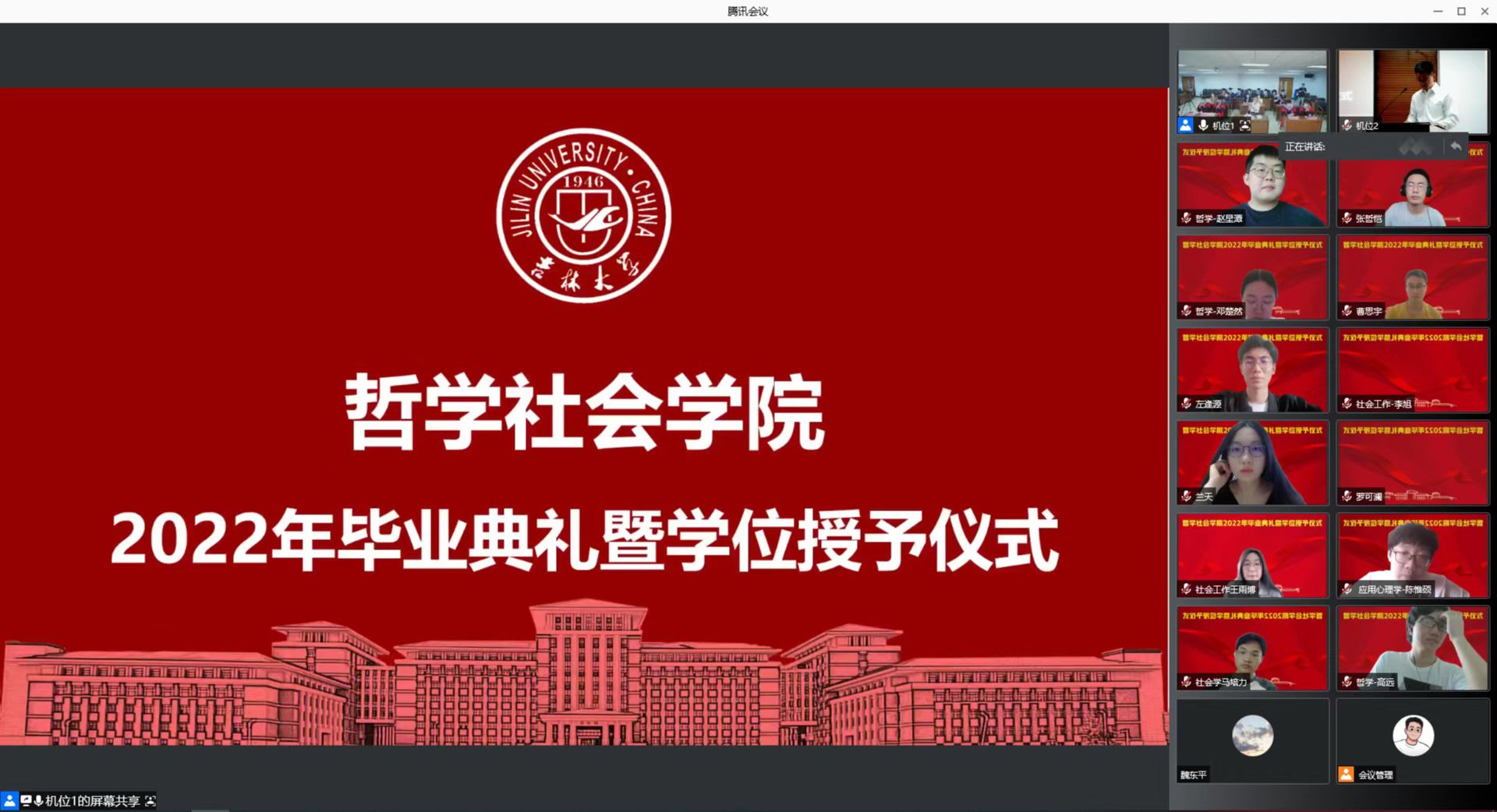院长田毅鹏、党委副书记赵洁、党委副书记兼副院长刘培强、副院长曲红梅、副院长芦恒、副院长王福生、哲学系副系主任高超、社会学系主任董运生、心理学系主任张彦彦、劳动与社会保障系主任董才生、学院教师代表社会学系教工党支部书记吴海琳,以及部分毕业生代表现场参加了典礼。同时,部分教师、全体毕业生通过线上会议的方式参加了典礼。典礼由学院党委副书记兼副院长刘培强主持。
