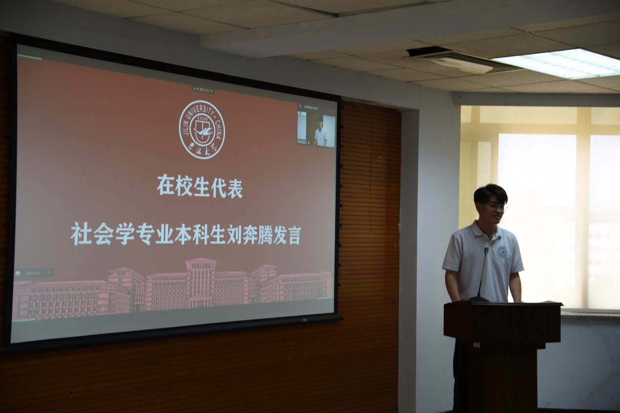 典礼第三项,学生代表发言。首先,毕业研究生代表陈俊昆同学发言。“一日归属吉大,一生念念不忘,”他说,“虽然此刻我们满怀毕业的激动和喜悦,但作为一名吉大人,一名哲社人,无论我们身在何方,无论我们相约何时,都请记得自己的身份。取得的成就,记得常与母校分享。”