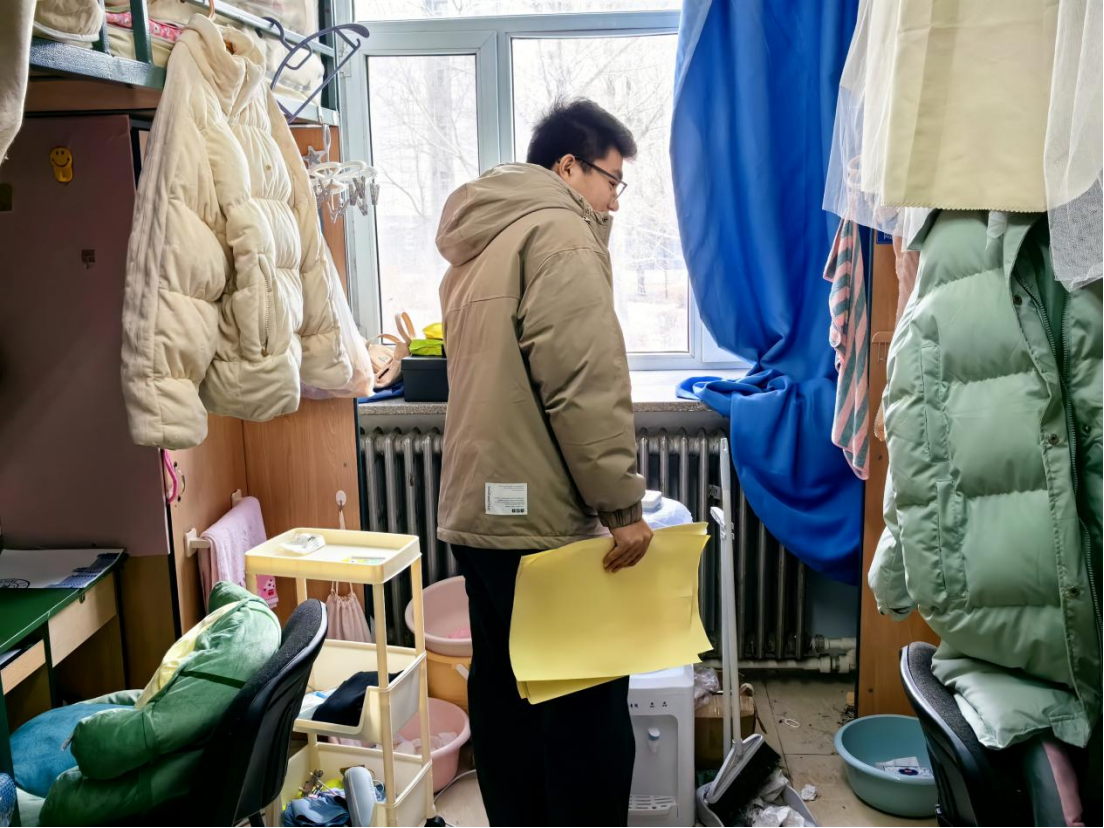 为严格落实学校《关于做好2025年寒假期间本科生管理工作的通知》《关于做好寒假期间学生公寓安全管理工作的通知》及相关会议要求,寒假伊始,学院党委副书记兼副院长刘培强带领学生工作办公室全体人员对我院本科生居住的南苑三、四公寓和北苑二公寓宿舍开展寝室安全检查及寒假留校学生走访慰问工作。