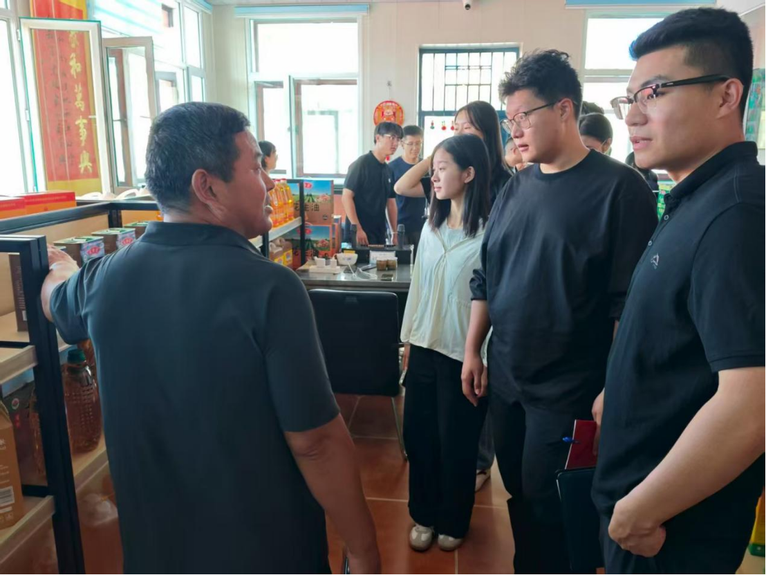 随后,团队转赴扶余市国义农产品购销有限公司,调研当地农产品花生的生产加工运输销售情况。讲解员围绕厂内主打的花生品牌发展、技术研发与花生的再加工深加工流程等方面进行了详细的讲解。同学们就国义农产品合作社“社企一体”,种植、加工、销售一条龙的经营模式进行深度调研,深入研讨了如何吸纳返乡大学生,扩展销售渠道,提升品牌知名度的问题。