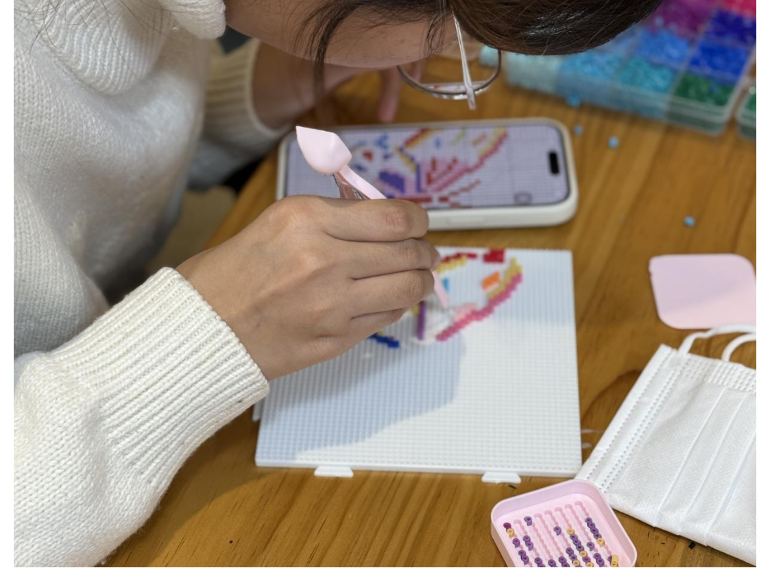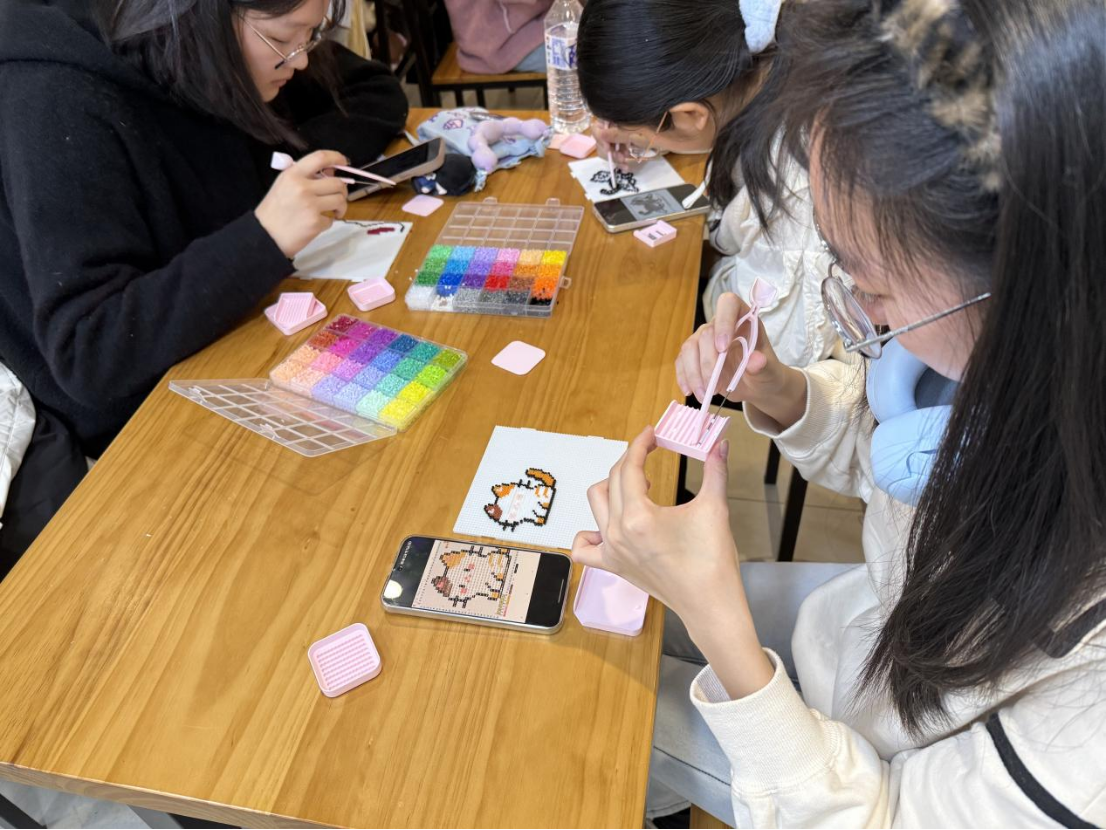 接下来,同学们纷纷投入到拼豆的制作中,大家先在网络上寻找了自己喜欢的样式,随后便拿起工具,沉浸在制作拼豆的乐趣之中。图案成型后大家拿着熨斗小心烫熨,一个个独一无二的拼豆作品就此诞生。