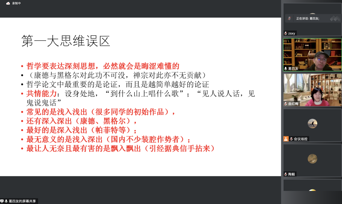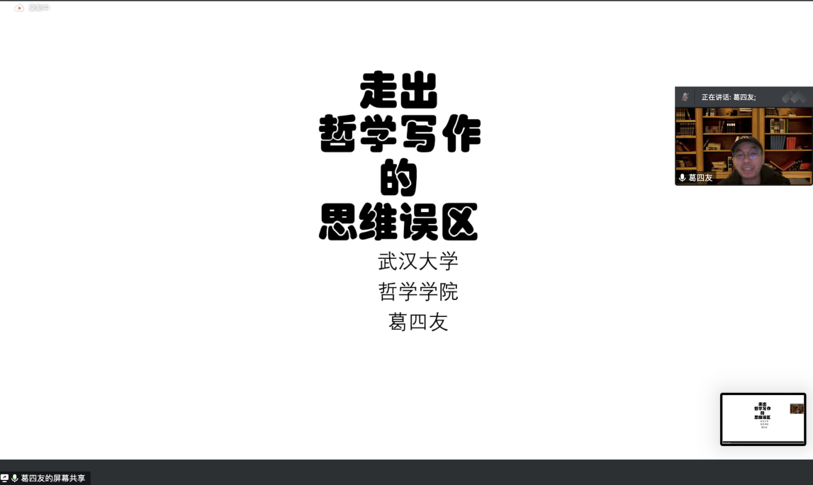 教育提升工程系列讲座第八讲”在线上顺利召开。本期讲座的主题为“走出哲学写作的思维误区”,主讲人为武汉大学哲学学院葛四友教授,主持人为我院曲红梅教授。讲座吸引了近三百名师生在线参与。