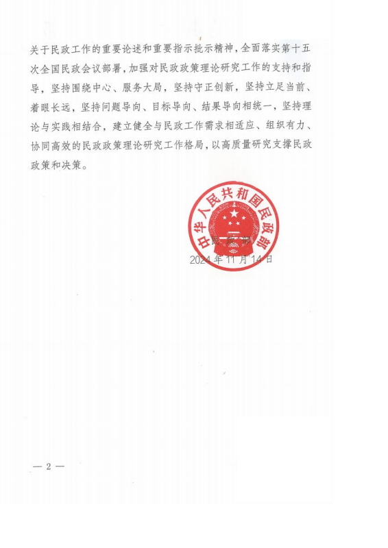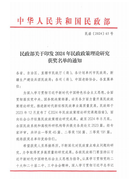 为深入学习贯彻习近平新时代中国特色社会主义思想,全面贯彻落实党中央、国务院决策部署,动员各方面力量开展民政政策理论研究,推进新时代新征程民政事业高质量发展,民政部于2023年12月发布了《2024年民政政策理论研究课题指南》,面向社会公开征集民政政策理论研究成果。本院学生积极参与此次活动。2024年11月1日,中华人民共和国民政部发布了关于印发2024年民政政策力量研究获奖名单的通知,重庆时时彩-重庆时时彩平台