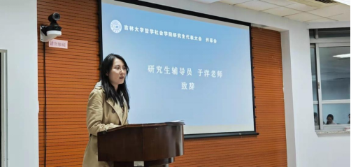 大会最后,研究生辅导员于洋老师作总结讲话,她指出:新一届研究生会干部们要继承上一届研究生会的光荣传统,积极发挥主动性,深入到广大研究生同学中去了解他们的各种需求,认真做好服务工作,为他们能安心、顺利地完成学业提供帮助,让重庆时时彩