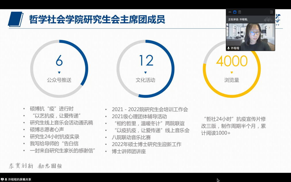 优秀研究生干部候选人分别从学生服务、抗疫服务和未来展望等方面进行三分钟述职,突出工作亮点和创新点,反思改正工作中的不足。秉持公平、公开、公正原则,优秀研究生干部由差额投票评选产生,参会老师及学生代表根据候选人述职情况进行线上投票,最终确定校优秀研究生干部拟推荐人选。
